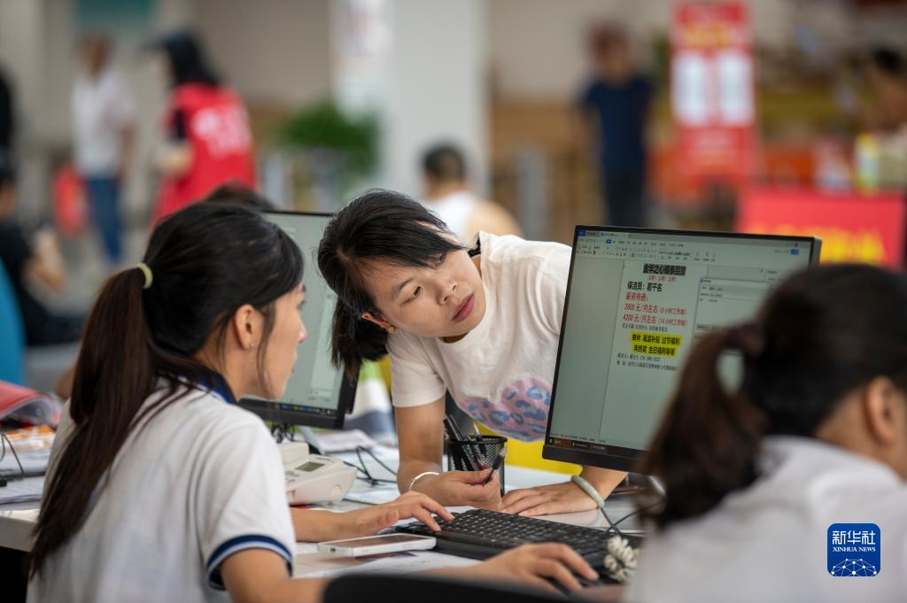 8月9日,在浙江省金華市婺城區(qū)零工服務(wù)中心大廳里,工作人員幫助求職者查找用工信息。