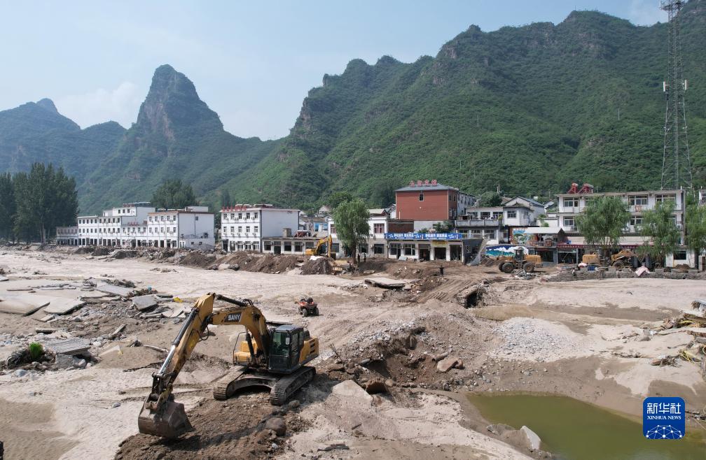 8月9日,工人操作機械設備搶修通往淶水縣三坡鎮上莊村的道路(無人機照片)。