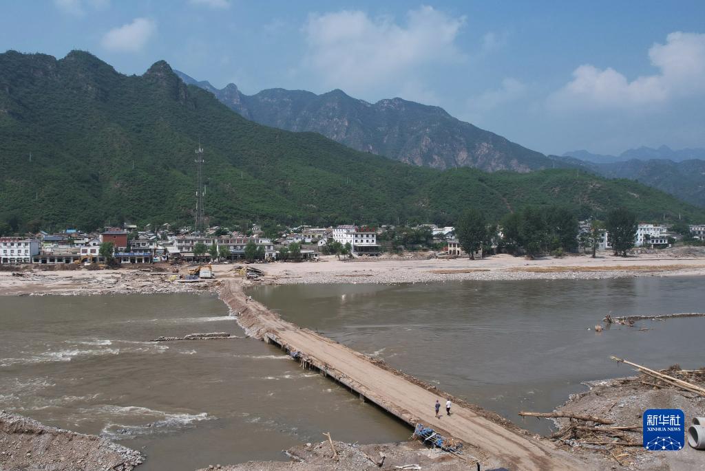 8月9日,淶水縣三坡鎮(zhèn)上莊村的村民從搶修好的進(jìn)村橋上通過(guò)(無(wú)人機(jī)照片)。