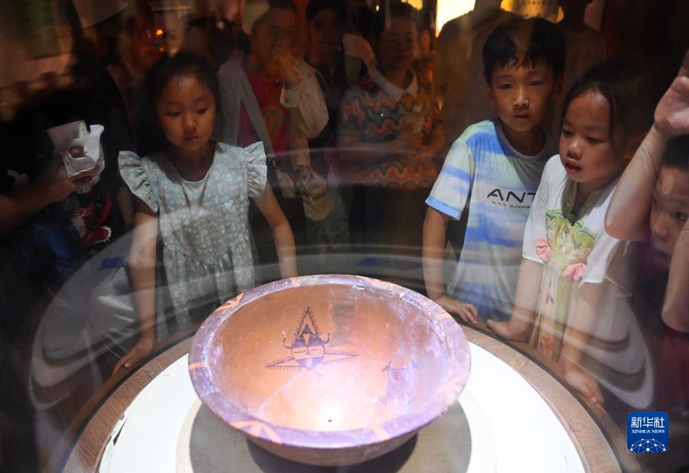 參觀者在西安半坡博物館里觀看人面網紋彩陶盆(8月9日攝)。