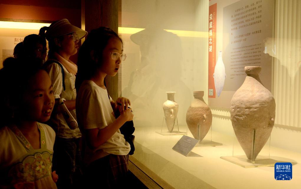 參觀者在西安半坡博物館里了解尖底瓶(8月9日攝)。