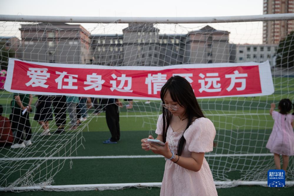 8月9日,在五常市時代中學集中安置點,一位女士與朋友通過手機聯系。