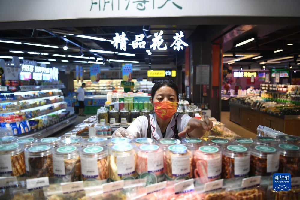 8月10日,涿州市惠友超市鉆石廣場店工作人員在貨臺整理商品。