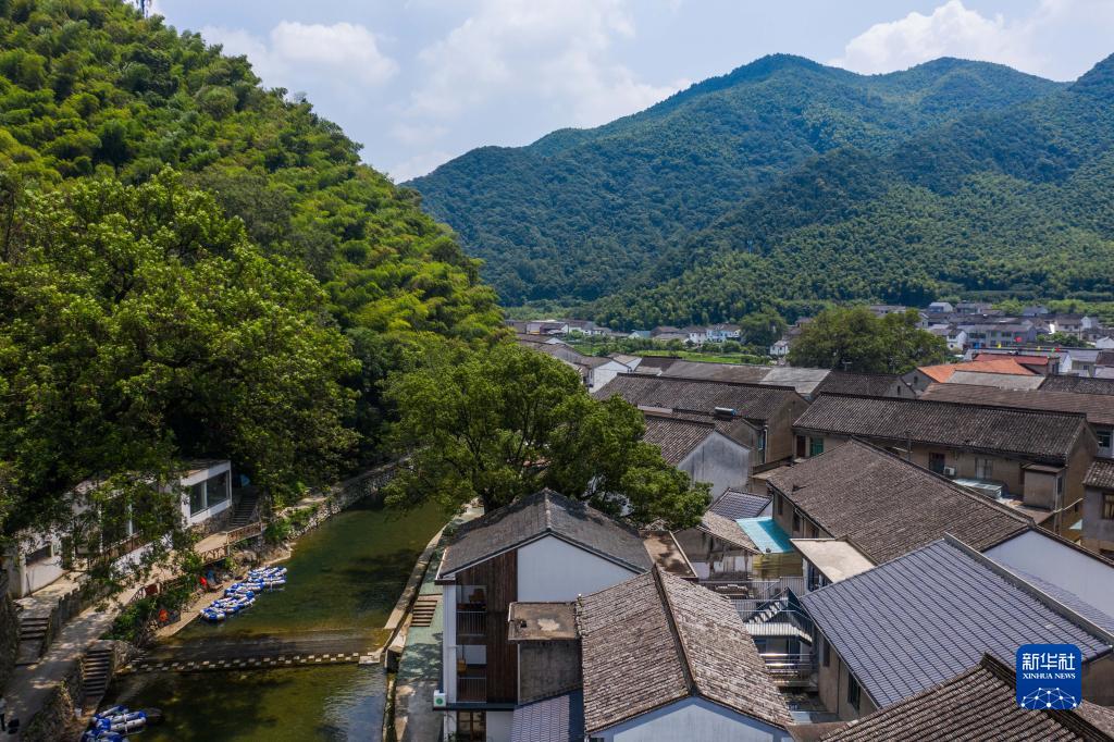 8月10日拍攝的群山環繞的寧波市鄞州區城楊村,該村是寧波“最美精品線路”的重要節點(無人機照片)。2020年城楊村積極推動特色鄉村旅游產業發展,集體經濟年收入從不足10萬元發展到如今年收入已超50萬元,每年接待游客超15萬人次。