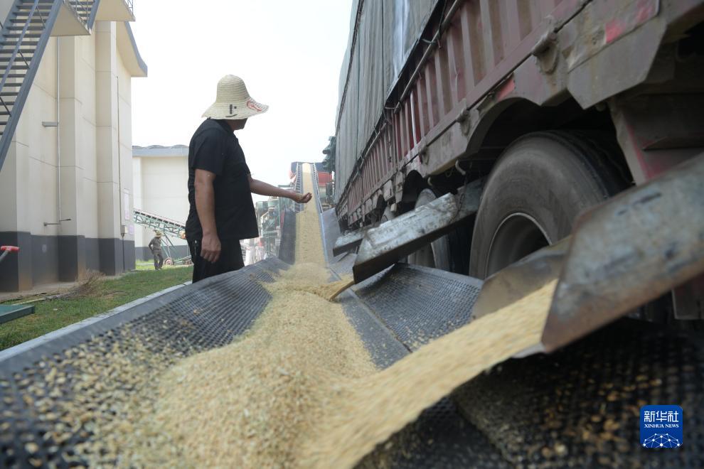 在江西省南昌縣橫崗國家糧食儲(chǔ)備庫,種糧大戶開倉卸載糧車上的早稻(8月8日攝)。