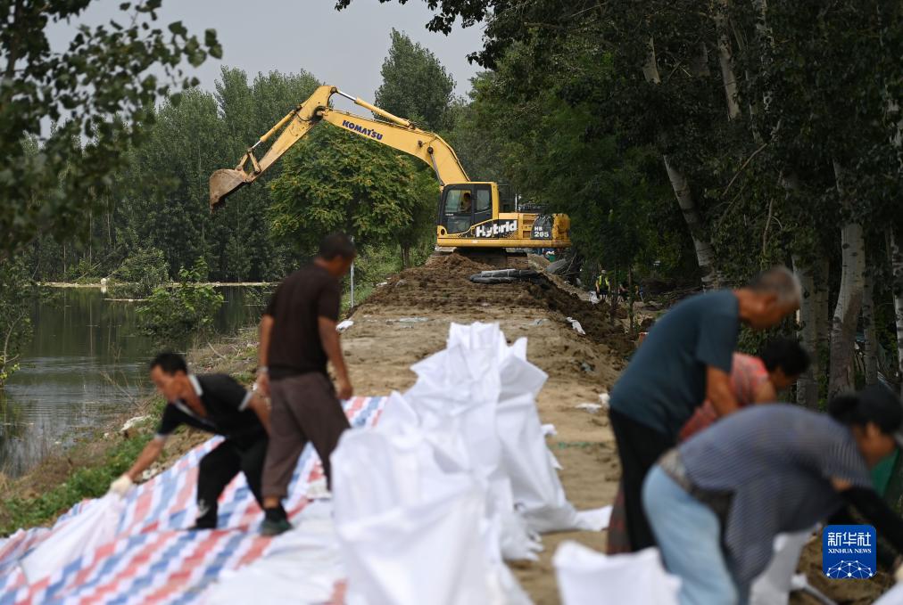 8月10日,在天津市靜海區(qū)大清河臺頭段南堤,工程機械設備在堤壩上作業(yè)。