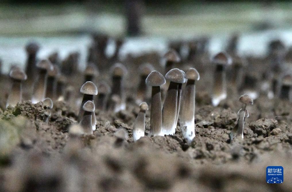 8月10日在山東省菏澤市定陶區(qū)一處食用菌種植基地內(nèi)拍攝的黑皮雞樅菌。