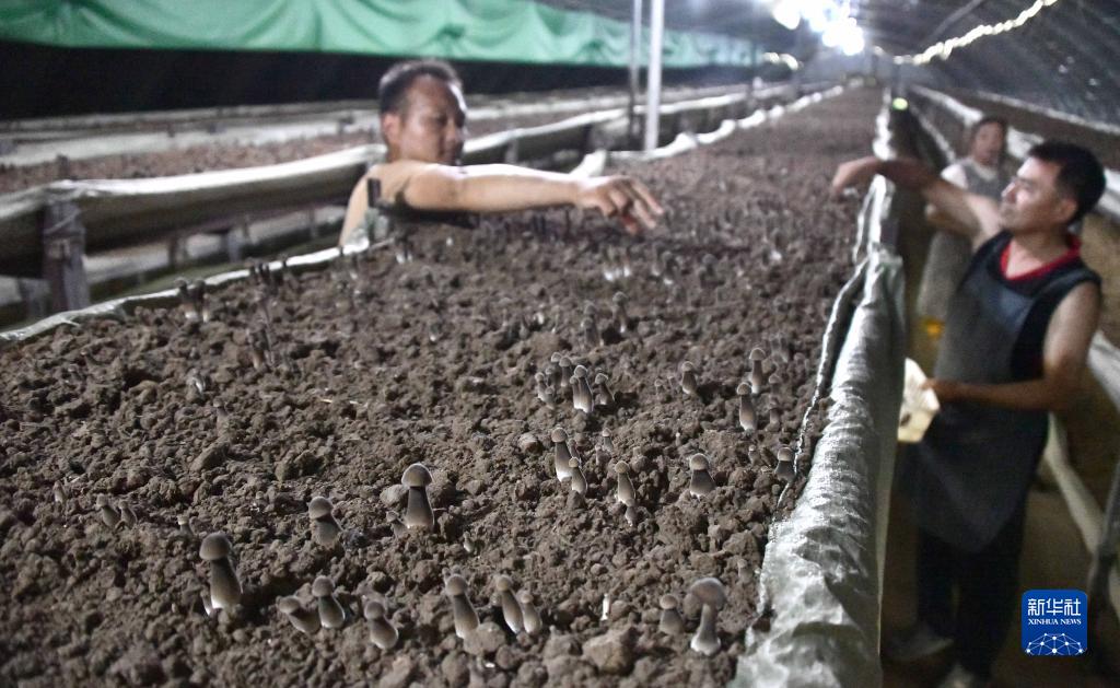 8月10日,在山東省菏澤市定陶區(qū)一處食用菌種植基地,工作人員在收獲成熟的黑皮雞樅菌。