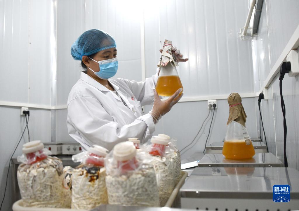 8月10日,在山東省菏澤市定陶區(qū)一處食用菌種植基地,工作人員在進(jìn)行黑皮雞樅菌的菌種制作工作。