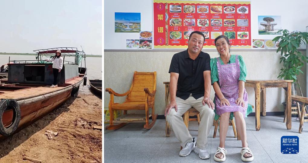 拼版照片:左圖為2020年3月20日,江西省九江市永修縣吳城鎮退捕漁民何桂花與自家漁船合影留念(資料照片);右圖為2023年7月16日,何桂花和丈夫徐禮淵在自家開的餐館里留影(新華社記者 萬象 攝)。