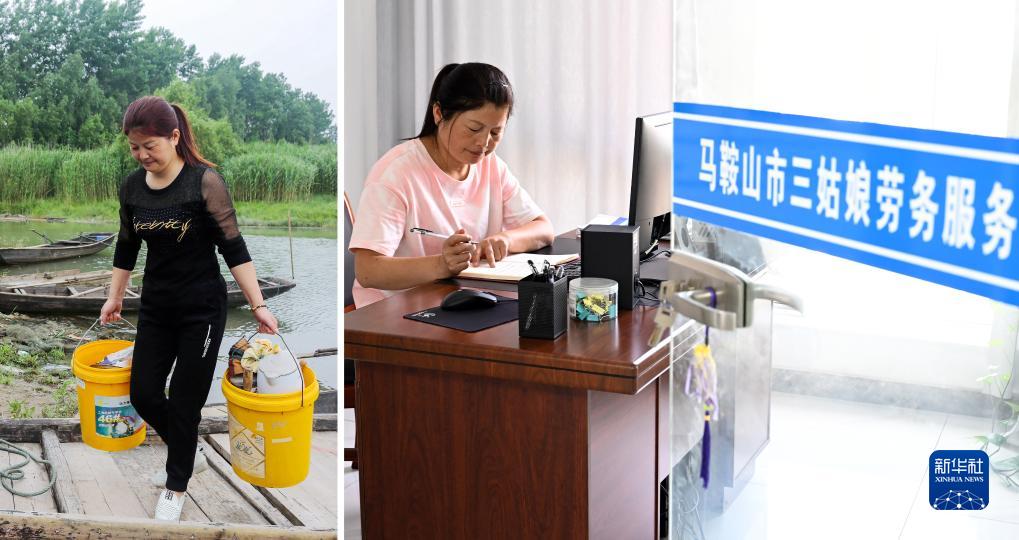 拼版照片:左圖為2019年5月15日,安徽省馬鞍山市薛家洼退捕漁民陳蘭香搬遷上岸(畢琛 攝);右圖為2023年7月24日,陳蘭香在馬鞍山市三姑娘勞務服務有限公司工作(新華社記者 周牧 攝)。