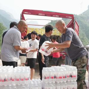 8月10日,在淶水縣龍門鄉(xiāng),村民將捐贈(zèng)的食品和飲用水卸車。