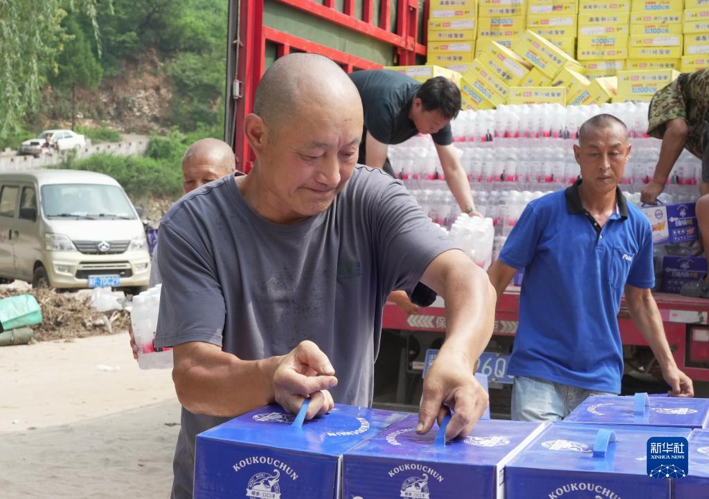 8月10日,在淶水縣龍門鄉,村民將捐贈的食品和飲用水卸車。