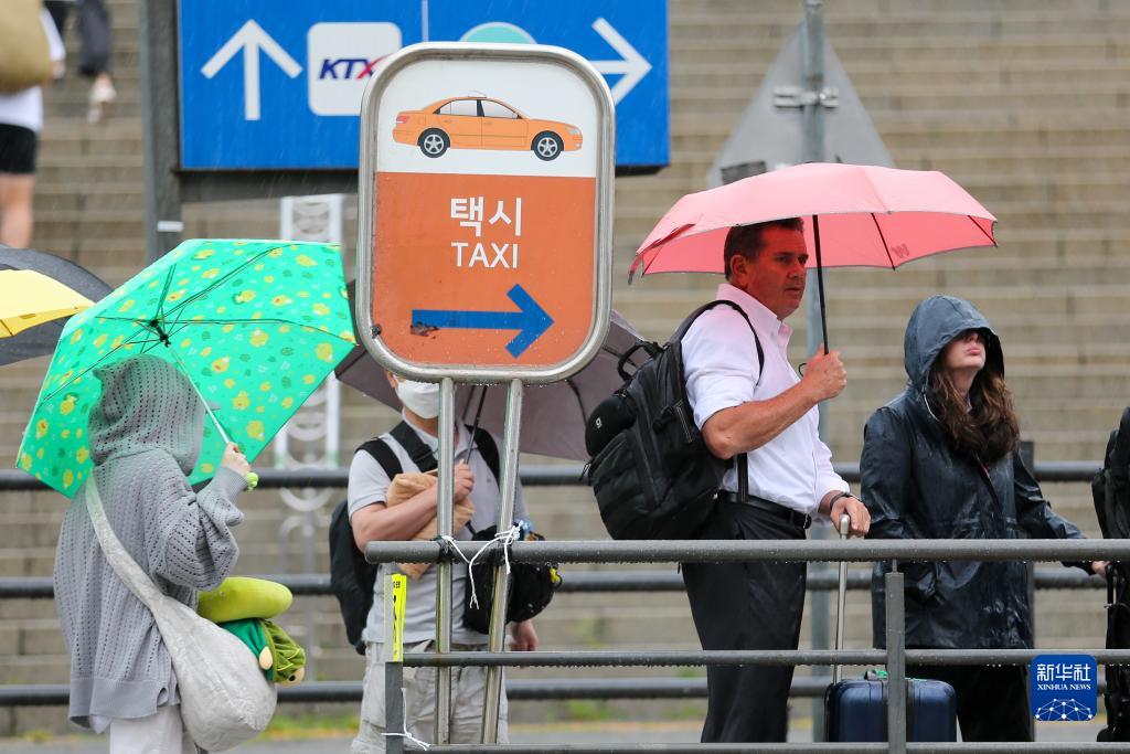 8月10日,在韓國首爾站外,人們?cè)谟曛信抨?duì)等出租車。