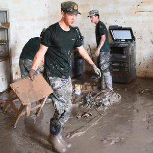 8月10日,武警河北總隊保定支隊戰士在涿州中學教學樓清理物品。