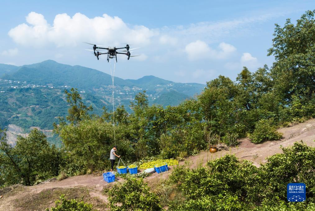 8月10日,技術(shù)人員在秭歸縣泄灘鄉(xiāng)坊家山村用無人機(jī)幫村民轉(zhuǎn)運(yùn)柑橘(無人機(jī)照片)。
