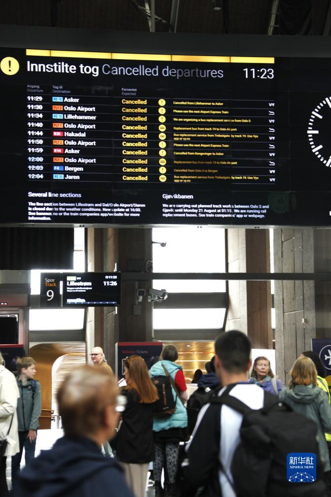 8月10日,在挪威首都奧斯陸的中央火車站,列車信息牌顯示多趟列車被取消。新華社記者 張玉亮 攝