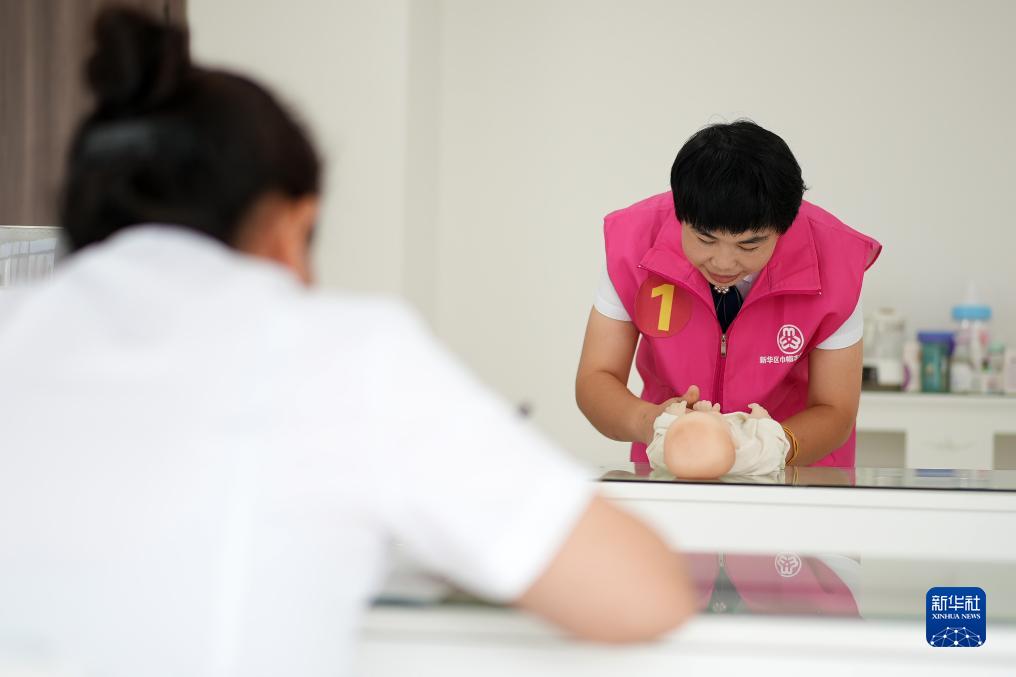 8月11日,在河北省滄州市新華區(qū)巾幗家政服務(wù)技能大賽比賽現(xiàn)場,參賽人員展示育嬰技能。
