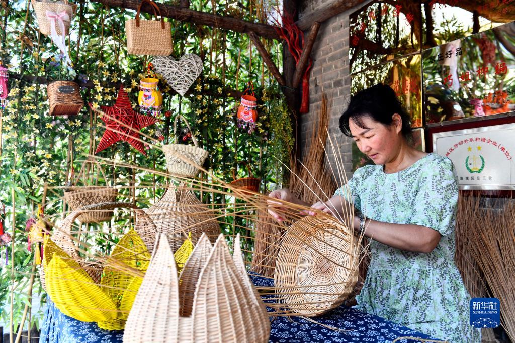 8月10日,在棗莊市薛城區(qū)柳編非遺工坊,非遺傳承人趙秀梅在制作柳編。
