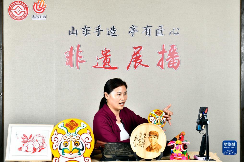 8月10日,在棗莊市山亭區(qū)非遺展示中心,工作人員在直播推介非遺作品。