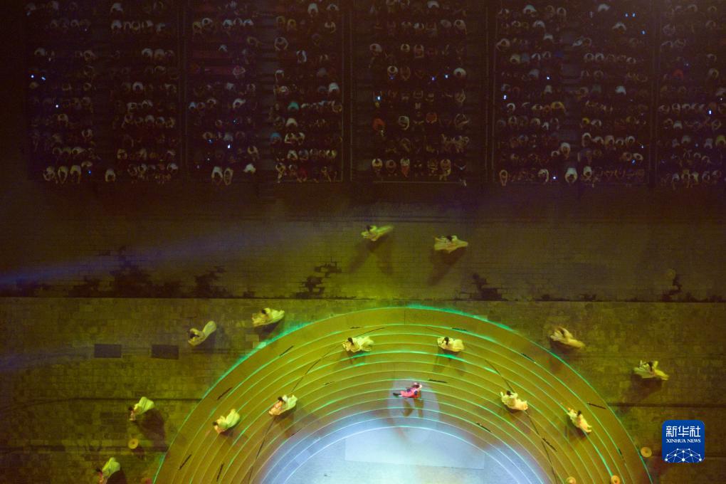 游客在西安城墻南門甕城內(nèi)觀看文藝表演(8月10日攝,無人機照片)。