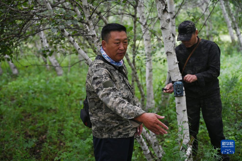 8月4日,白巴嘎那(左)指導(dǎo)同事架設(shè)紅外相機(jī)。