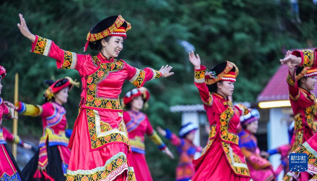 演員在威寧彝族回族苗族自治縣火把節活動上表演撒麻舞(8月10日攝)。