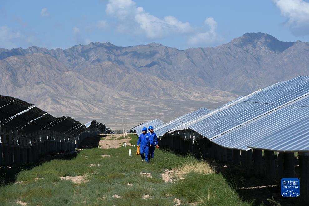 8月11日,工作人員在中國能建張掖甘州南灘30萬千瓦光伏發(fā)電項目巡檢。