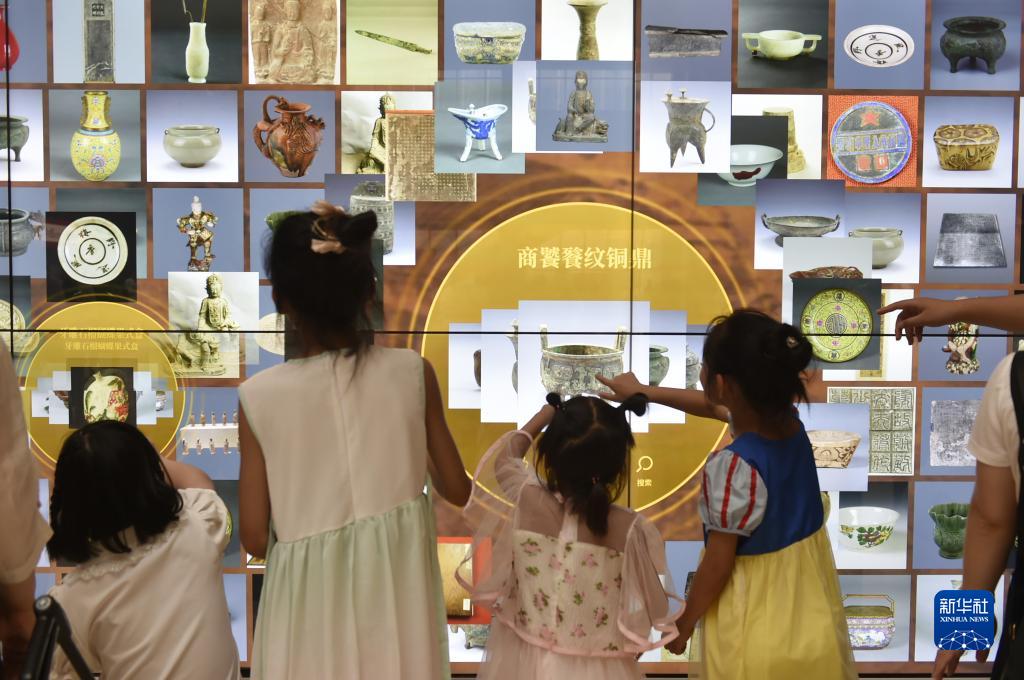 8月9日,小朋友在河南省開封市博物館里體驗文物電子展示交互大屏。