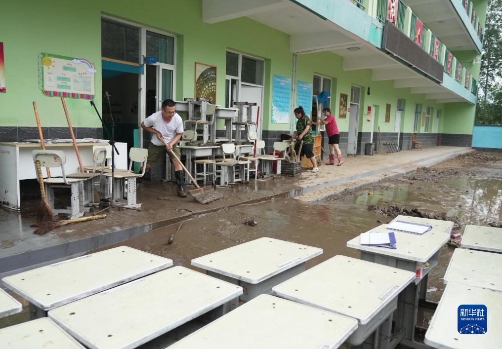 8月11日,在河北省淶水縣其中口鄉,學校老師在清理教室內的淤泥。
