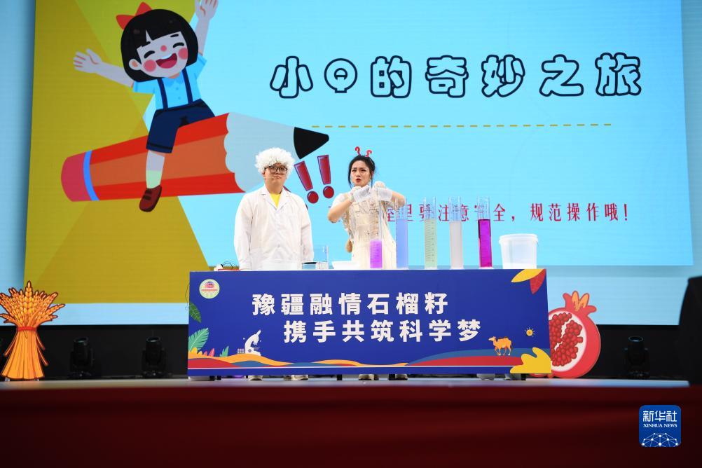 8月10日,在河南省科技館新館,工作人員在夏令營開營儀式上表演節目。
