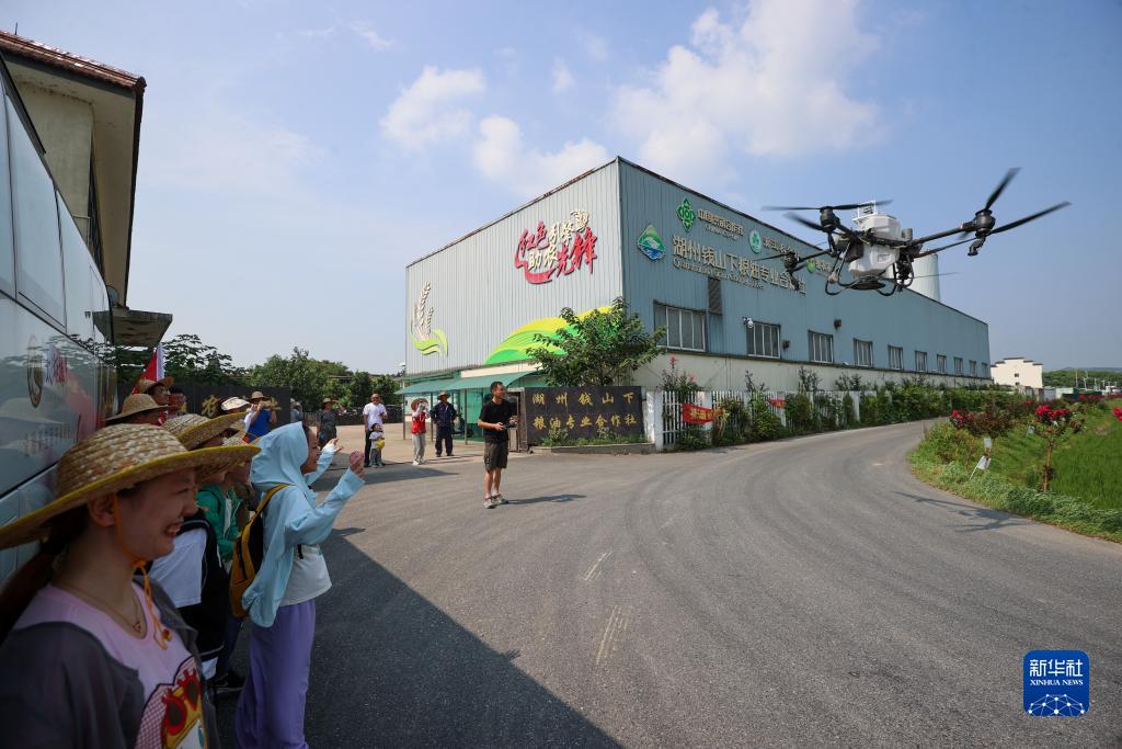 8月11日,在吳興區(qū)道場鄉(xiāng)錢山下糧油專業(yè)合作社,小朋友在了解植保無人機的工作原理。
