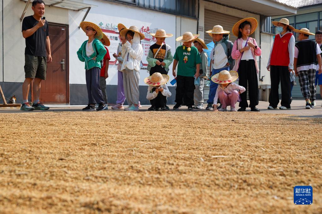 8月11日,在吳興區道場鄉錢山下糧油專業合作社,小朋友在查看剛收獲的稻谷。
