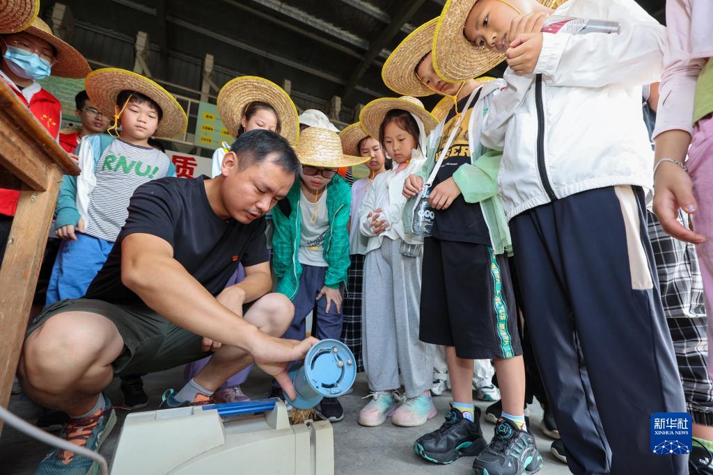 8月11日,在吳興區(qū)道場鄉(xiāng)錢山下糧油專業(yè)合作社,小朋友在了解糙米的形成。