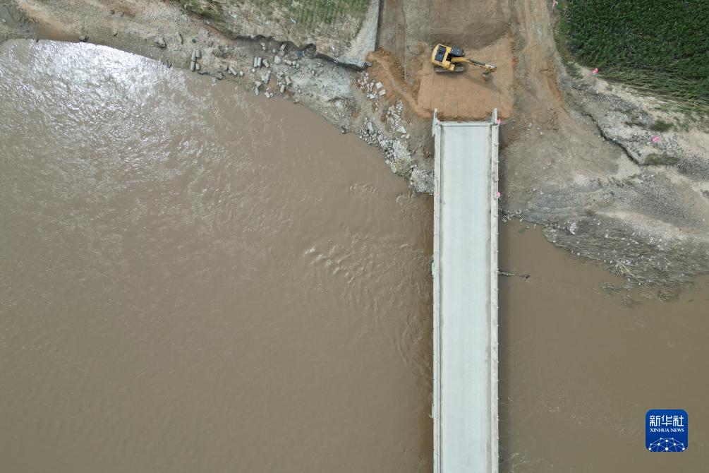 8月11日,工作人員在黑龍江省尚志市馬延鄉(xiāng)馬延大橋搶修現(xiàn)場(chǎng)進(jìn)行施工作業(yè)(無(wú)人機(jī)照片)。