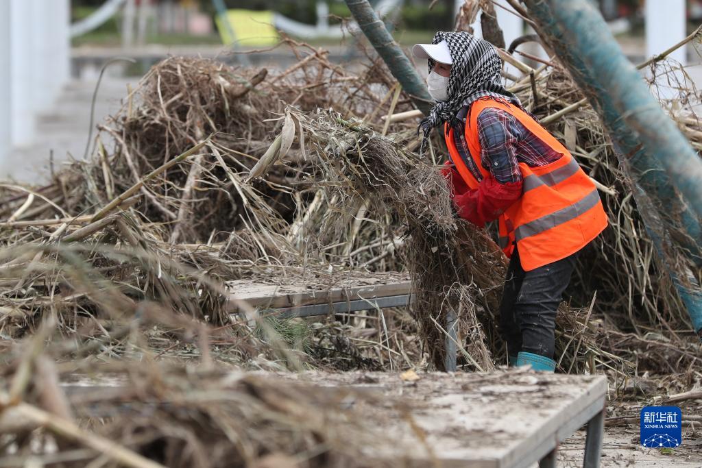 8月11日,在黑龍江省尚志市尚志大街附近,環衛工人在清理洪水沖來的雜物。