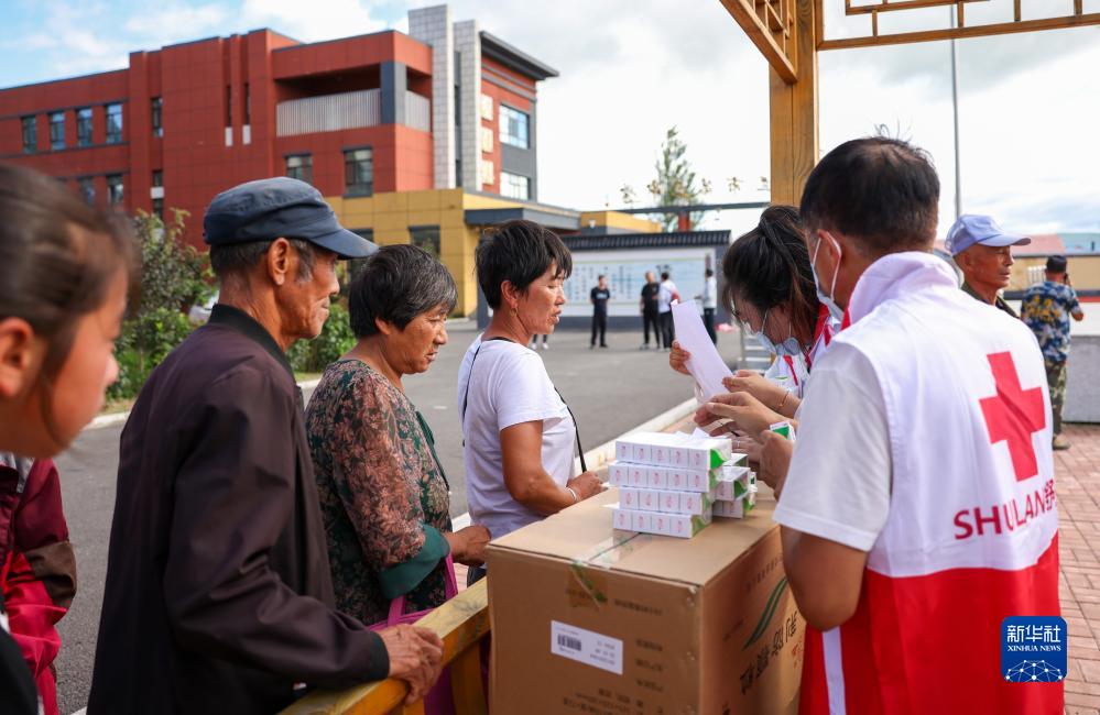8月11日,居民在吉林省舒蘭市舒蘭三中居民安置點領取舒蘭市紅十字會發放的藥品物資。