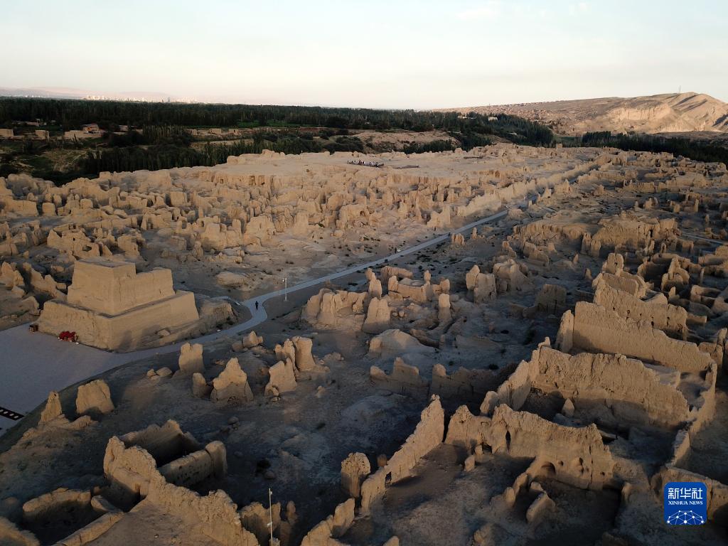 8月11日拍攝的夕陽下的交河故城(無人機(jī)照片)。