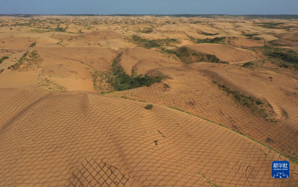 這是8月11日拍攝的達拉特旗境內的庫布其沙漠中的沙障(無人機照片)。