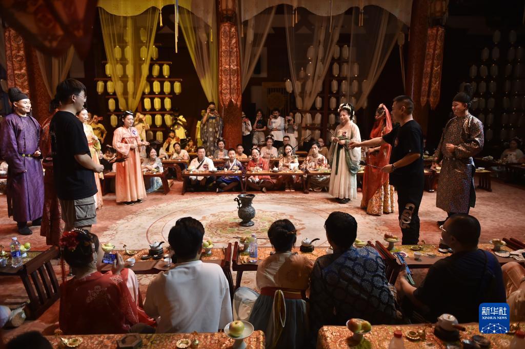 8月11日晚,游人在洛陽(yáng)應(yīng)天門遺址博物館內(nèi)和演員參加互動(dòng)游戲。