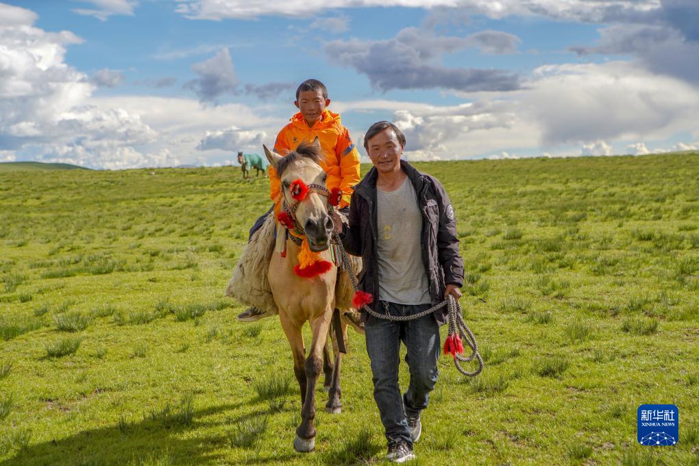 列熱覺旦騎著馬,他的父親次扎達(dá)牽著馬行走在草原上(8月9日攝)。