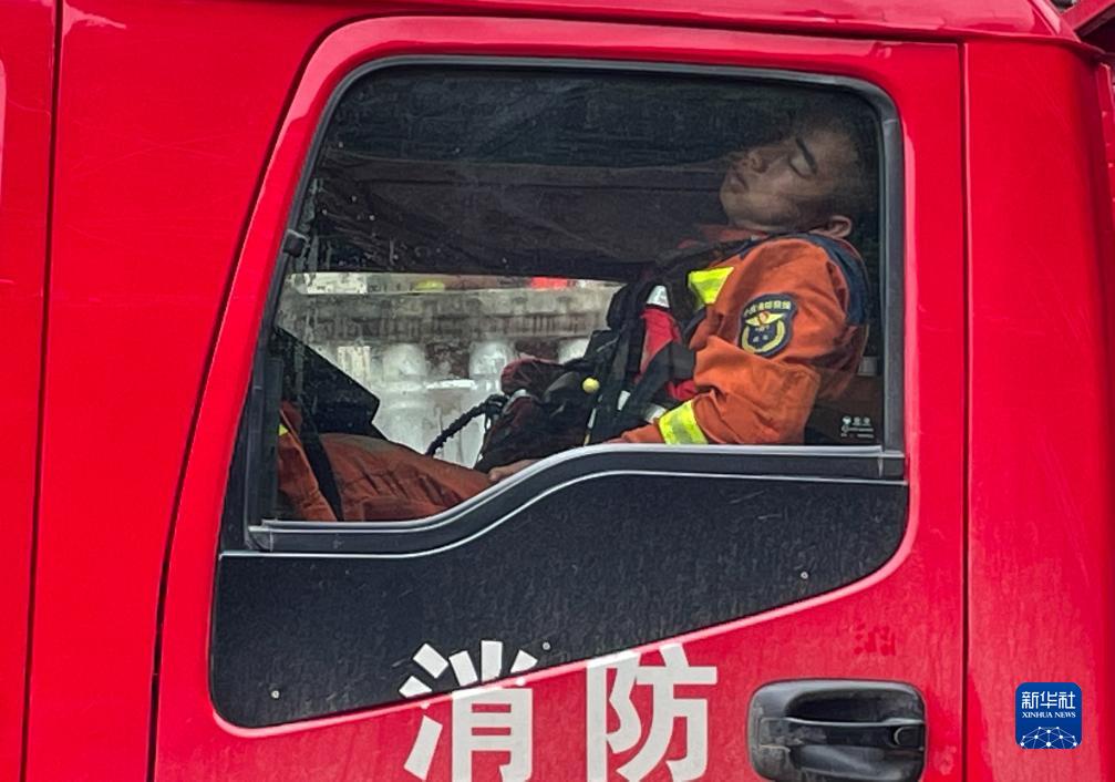 8月12日,救援人員在搜救間隙休息。