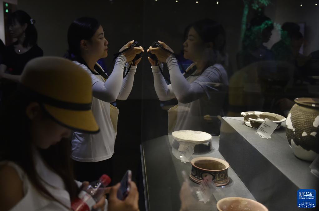 8月8日,參加集中采訪的媒體記者在位于河南省鄭州市的大河村遺址博物館參觀拍照。