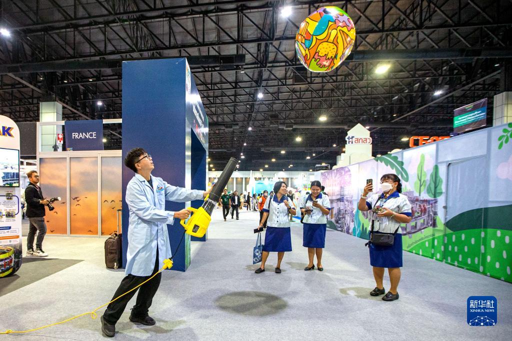 8月11日,在泰國曼谷舉辦的泰國國家科學技術展上,參觀者在中國館觀看沙灘球實驗。