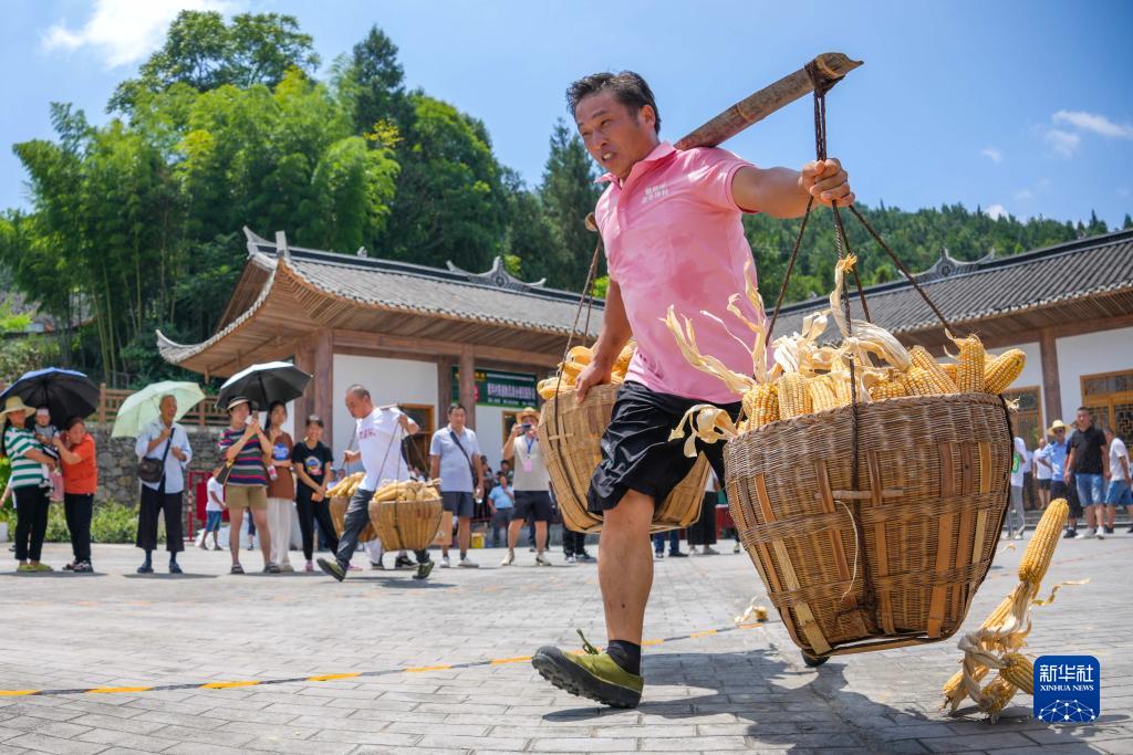 8月12日,村民在宣恩縣椒園鎮(zhèn)黃坪村的景區(qū)趣味運動會上參加挑玉米比賽。