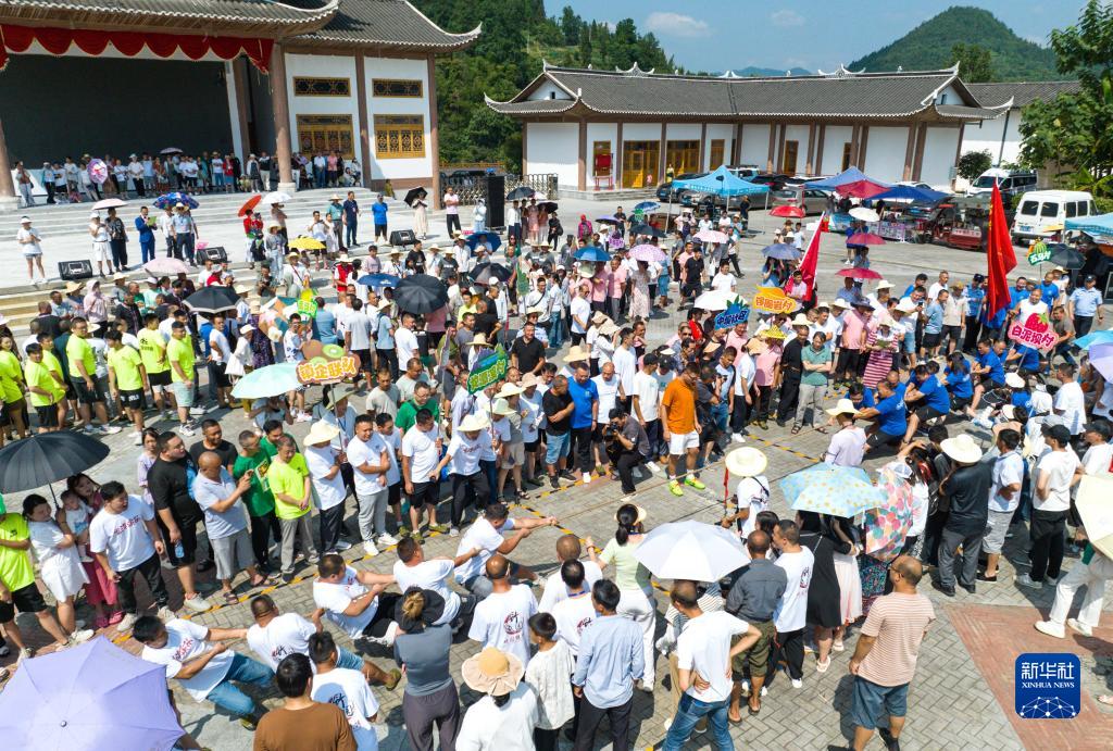 8月12日,人們?cè)谛骺h椒園鎮(zhèn)黃坪村的景區(qū)趣味運(yùn)動(dòng)會(huì)上參加拔河比賽(無(wú)人機(jī)照片)。