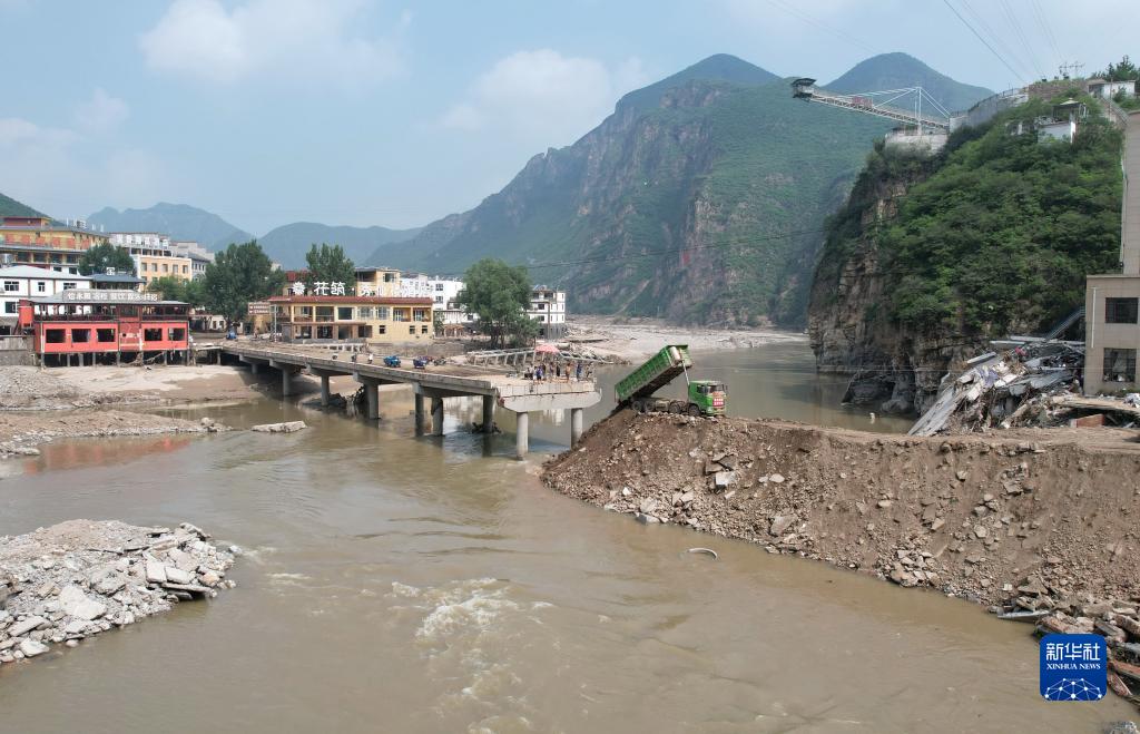 8月9日,工人操作機械設(shè)備搶修通往淶水縣三坡鎮(zhèn)劉家河村的橋梁(無人機照片)。