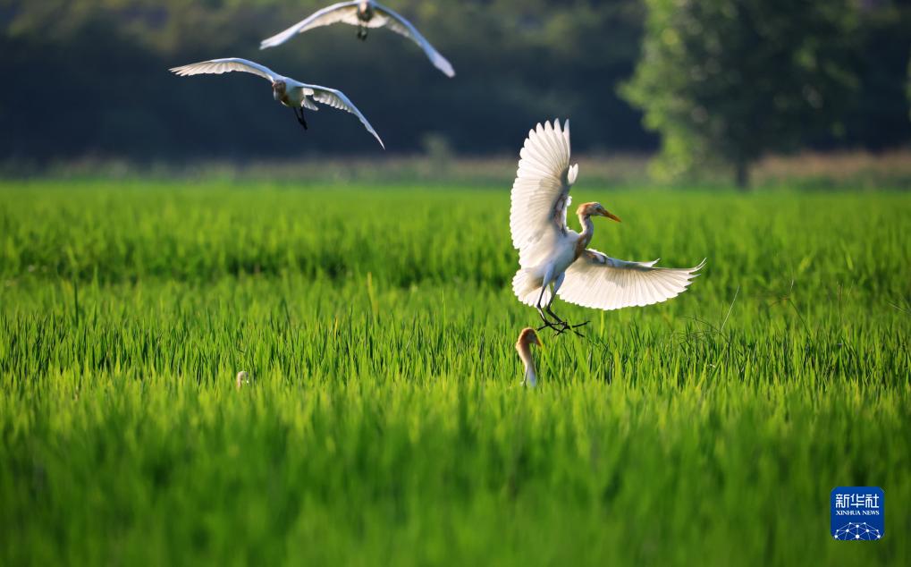 8月7日,鷺鳥在山東省臨沂市郯城縣郯城街道水稻田間飛舞。