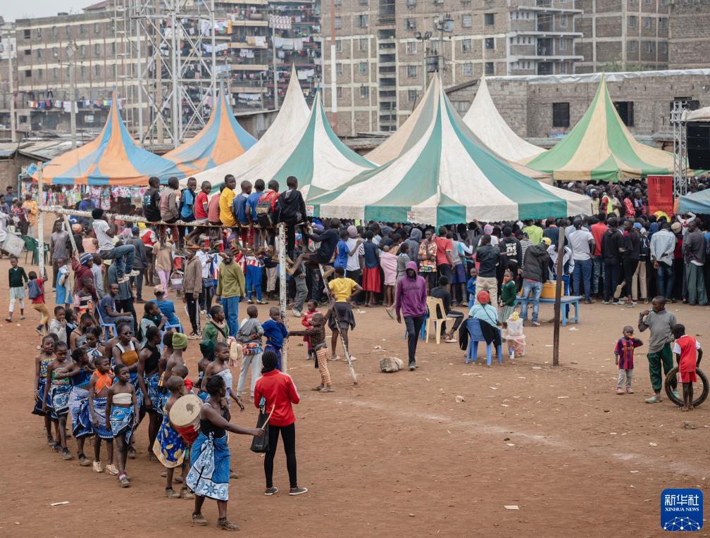 8月11日,在肯尼亞內(nèi)羅畢的馬薩雷貧民區(qū),人們在“貧民區(qū)嘉年華”活動上觀看表演。