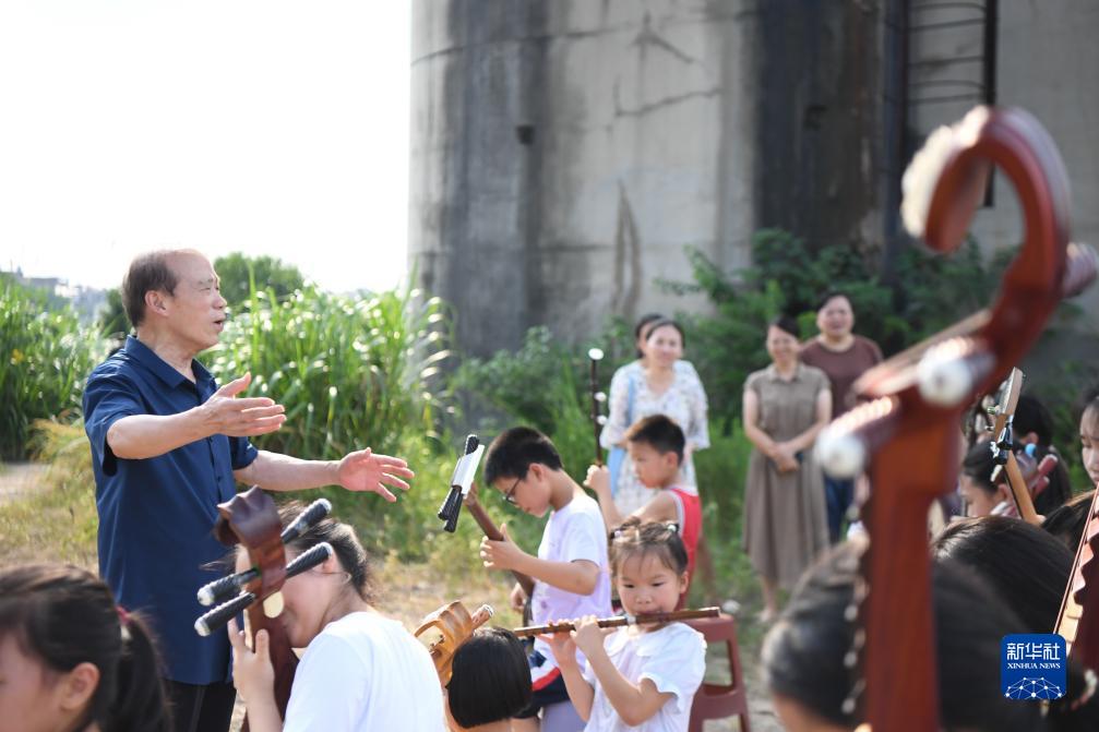 8月12日,李舒尤(左一)在枧頭洲村戶外指揮學生們合奏。